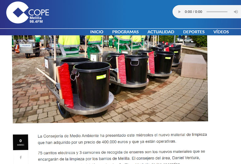 La Consejería de Medio Ambiente y Naturaleza de la Ciudad Autónoma de Melilla ha reforzado recientemente su servicio de limpieza viaria con la incorporación de 75 carritos eléctricos al servicio prestado por la empresa concesionaria VALORIZA. Estos carros, fabricados en España, está diseñados para mejorar la eficiencia y dignificar la labor de los operarios en la vía pública.