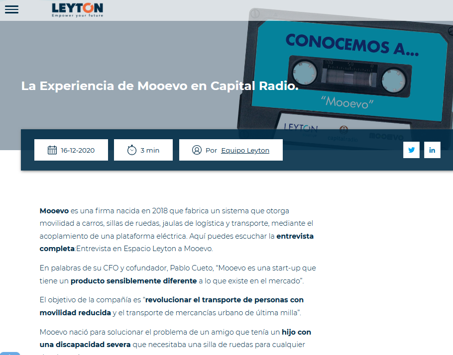 Mooevo es una firma nacida en 2018 que fabrica un sistema que otorga movilidad a carros, sillas de ruedas, jaulas de logística y transporte, mediante el acoplamiento de una plataforma eléctrica. Aquí puedes escuchar la entrevista completa:Entrevista en Espacio Leyton a Mooevo. En palabras de su CFO y cofundador, Pablo Cueto, “Mooevo es una start-up que tiene un producto sensiblemente diferente a lo que existe en el mercado”. El objetivo de la compañía es “revolucionar el transporte de personas con movilidad reducida y el transporte de mercancías urbano de última milla”.